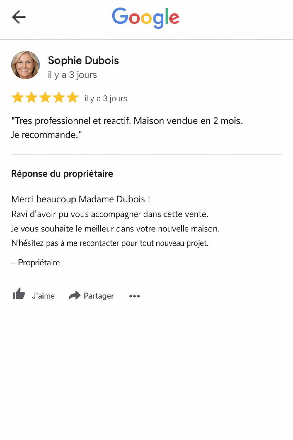 Avis 4★ : "Agent très pro, m'a aidé à vendre ma maison en 3 mois!"